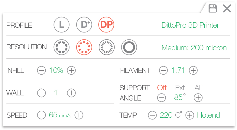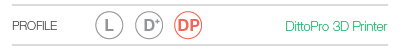 Change printing profiles. “L” for Litto users, “D+” for Ditto+ users, and “DP” for DittoPro users.